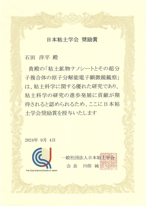 日本粘土学会奨励賞を受賞しました!/Yohei was awarded The Clay Science Society of Japan Award for Young Scientist!